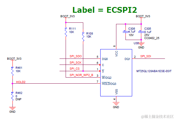 如下是典型的QSPI NOR硬件连接设计,示例NOR芯片是MT25QL128ABA1ESE-OSIT,该NOR芯片为Multiple I/O,数据线为DQ[3:0],当用作1-bit SPI模式时,仅需连接DQ[1:0]: