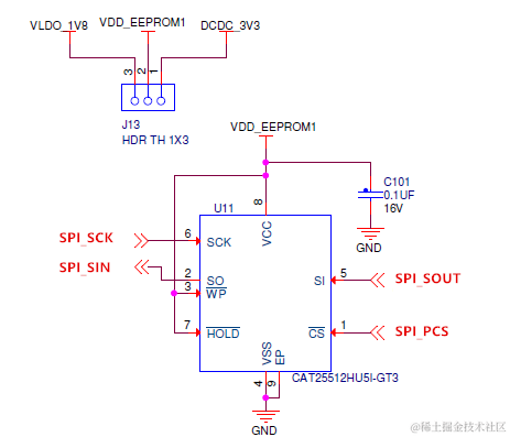 如下是典型的SPI EEPROM硬件连接设计,示例EEPROM芯片是CAT25512HU5I-GT3,标准1-bit SPI,直接连接即可: