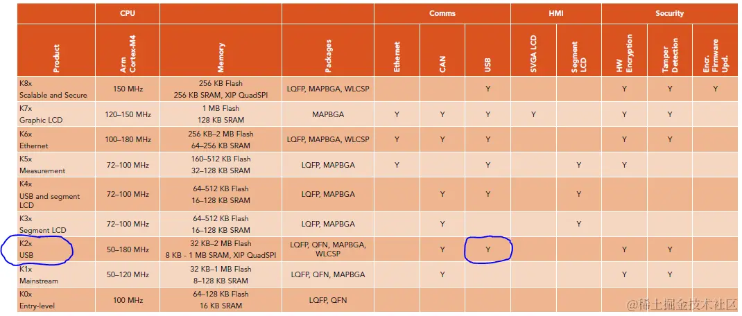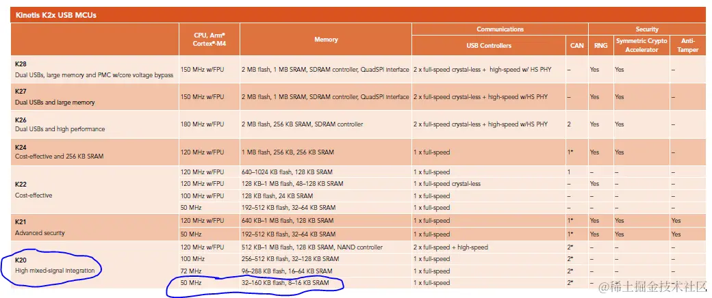 为何选择Kinetis芯片作为调试器主控?当然是为了进一步推广Kinetis系列的知名度,毕竟飞思卡尔的Cortex-M芯片推出较晚。那么为何选择Kinetis K2x系列芯片呢?这要从下面Kinetis K系列的特性表里才能找到答案,从下表可以我们看出K2x系列是支持USB接口的入门芯片,而调试器主控是必须要支持USB接口的。