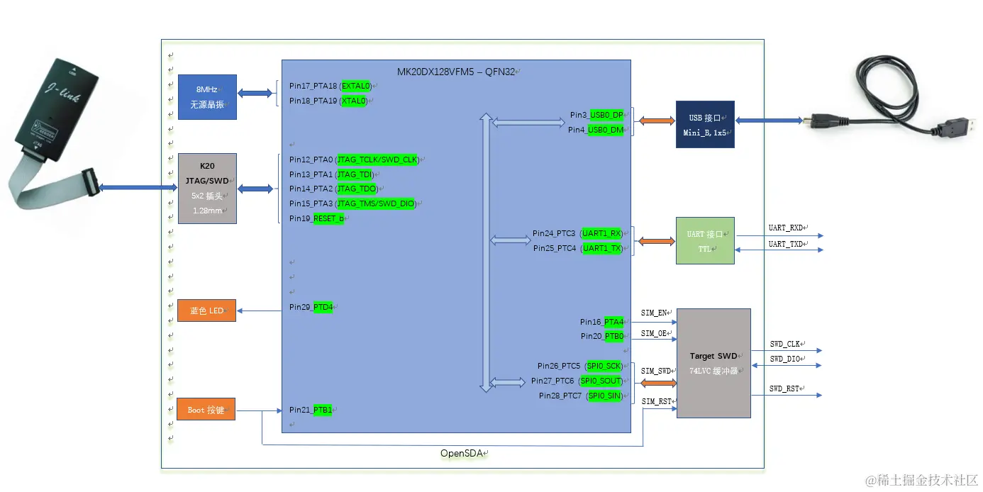 不过这些版本主要都是硬件设计细节方面的小改动,而对于调试器软件开发而言其实并没有变化,因为接口Pinout并没有改变,痞子衡将上述各开发板原理图里的OpenSDA电路仔细查看对比整理出了如下通用的OpenSDA硬件原理简图: