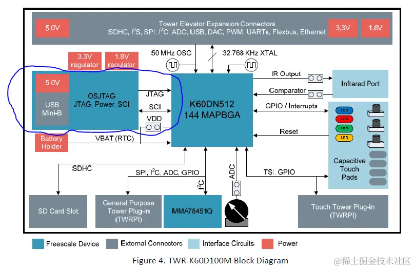 众所周知,ARM公司于2010年2月正式发布Cortex-M4内核,飞思卡尔于2010年8月推出其第一款ARM Cortex-M内核芯片Kinetis K60,这也是业界一款Cortex-M4内核的芯片。OpenSDA项目并不是从Kinetis诞生之初便存在的,不信你可以查看最早的Kinetis Tower开发板 TWR-K60D100M 原理图(该板通用于Kinetis K10、K20、K60芯片),早期的Kinetis开发板板载调试器为OSBDM/OSJTAG,这是一种早已普遍应用于飞思卡尔HCS12、DSC、PowerPC系列芯片开发板上的调试器,OSBDM/OSJTAG调试器主芯片为MC9S08JM60CLD(S08JM系列)。