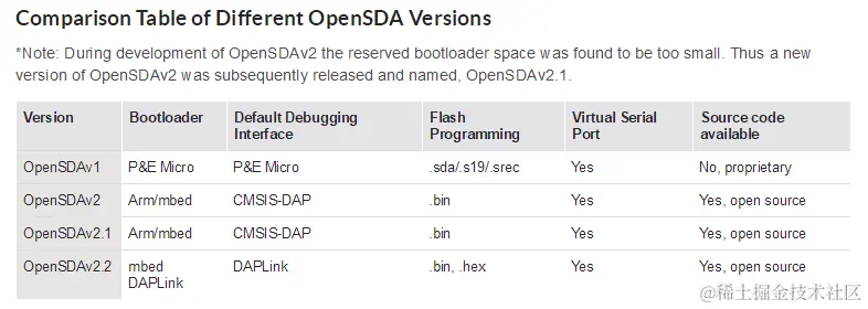 随着OpenSDA项目的不断迭代,目前(2018年9月)OpenSDA调试器版本已经更新到V2.2,飞思卡尔官网有 OpenSDA项目主页,在主页上我们可以看到如下OpenSDA项目版本对比: