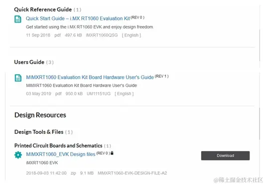 相信大家拿到EVK板第一时间肯定是有点小激动(尤其是有开发板收藏癖的技术宅),激情稍退后开始想了解具体的板载资源,看看EVK板上到底有哪些东西可玩,咱们继续回到 MIMXRT1060-EVK主页 往下翻,你可以找到如下几个重要文档: