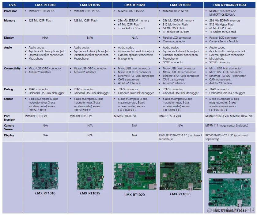 恩智浦(现恩智浦)自2017年推出i.MXRT系列MCU以来,至今已发布数款新品(RT1050、RT1020、RT1060...),每一款芯片都配套了EVK板,下图是截止目前所有EVK的板载资源的对比,今天痞子衡就选择其中资源最丰富的MIMXRT1060-EVK来具体聊一聊。