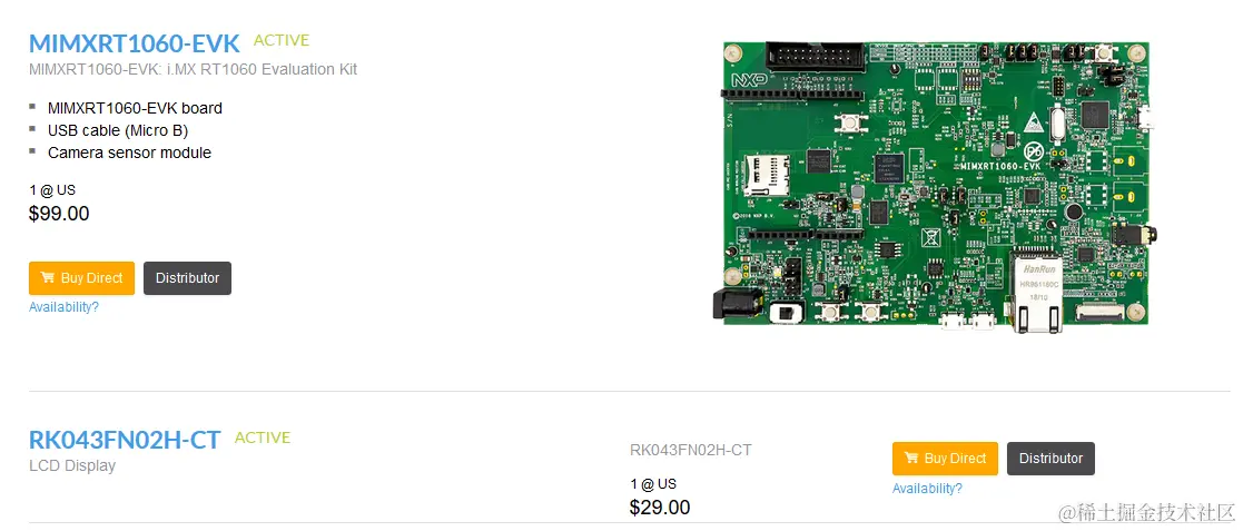 虽然获取EVK的方式并不唯一(比如积极参加官方送评估板活动、或者直接向官方申请评估板、也可以联系官方FAE借评估板、还有土豪玩家直接花钱购买),但其中最直接的方式肯定是从官网链接购买,打开恩智浦官网,进入 MIMXRT1060-EVK主页,可以看到如下购买入口,点击【Buy Direct】进入填收货信息并支付即可。