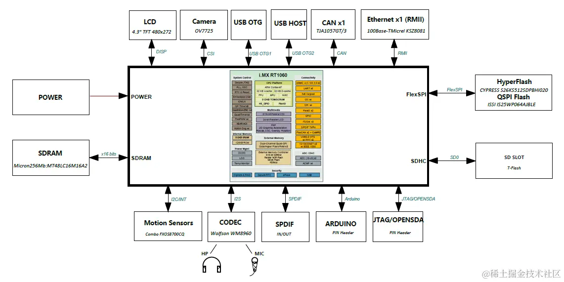 现在让我们打开RT1060参考手册与RT1060-EVK原理图,尝试把EVK板载资源与RT1060芯片外设模块联系起来,从下图可以看出,RT1060-EVK板载资源基本上能验证90%的RT1060芯片内部外设,从存储器接口到音视频接口、从传感器接口到各种网络接口应有尽有,基于RT1060-EVK评估板,你可以尽情设计你的酷炫应用。