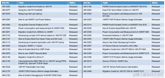 | 官方汇总 | i.MXRT产品主页 | 恩智浦官方i.MXRT产品主页,最权威的资料都在这里,参考手册/数据手册,官方EVK板设计文件,各种应用笔记,各种参考设计方案、培训视频、软件SDK开发包,官方IDE/CFG工具,第三方软件支持等应有尽有,如果这上面文档你都能全部仔细看一遍,软件都能下载用起来,不用怀疑,你就是资深专家了。 其中痞子衡特别推荐你把所有应用笔记都看一遍,这些笔记凝结了所有恩智浦应用工程师的经验,相比参考手册而言,应用笔记读起来完全不枯燥,截止到2019年7月共有如下35篇笔记,基本涵盖了核心知识域: |