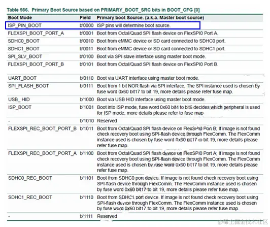 芯片内部OTP memory中的PRIMARY_BOOT_SRC[3:0]位和芯片外部管脚ISP[2:0]状态共同决定了i.MXRTxxx Boot行为的最顶层配置,但是与上一篇文章里介绍的Kinetis/LPC/STM32 Boot Mode配置不同的是,i.MXRTxxx上电永远是从ROM里开始启动,此处的PRIMARY_BOOT_SRC[3:0]和ISP[2:0]决定的仅是BootROM程序的不同行为模式(执行代码分支),而Kinetis/LPC/STM32 Boot Mode侧重的是决定CPU从ROM还是FLASH里启动。