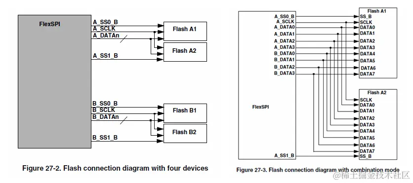 Parallel mode:如下图左边Flash A1+B1或Flash A2+B2,同一时刻两个四线QSPI Flash可以一起被操作(两个PORT都有数据收发),FlexSPI会自动合并/拆分数据(read/program)到两个PORT。