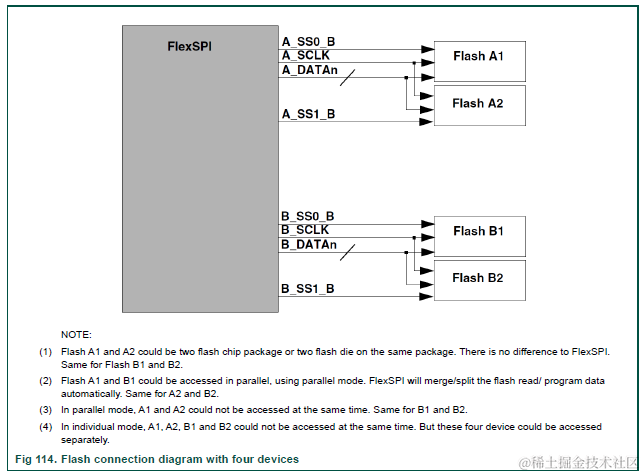 - Individual mode:如下图Flash A1+A2+B1+B2(四线/八线Flash均可),它们分时复用FlexSPI,同一时刻仅有一个Flash被操作(仅一个PORT有数据收发)。