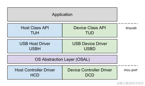 此协议栈使用信号量/互斥量来访问共享资源,因此需要使用到 OS 的一些 API。目前 TinyUSB 支持 FreeRTOS 及 Mynewt 两种 OS。