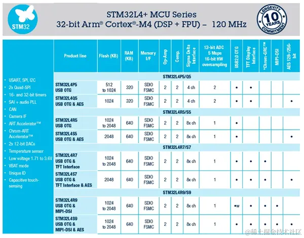 意法半导体最新推出的适用于成本敏感且注重功耗的智能物联网设备的微控制器 STM32L4+,主打能源表、工业传感器、医疗传感器、健身跟踪器、智能家居设备等设备,其系列产品的硬件资源如下。
