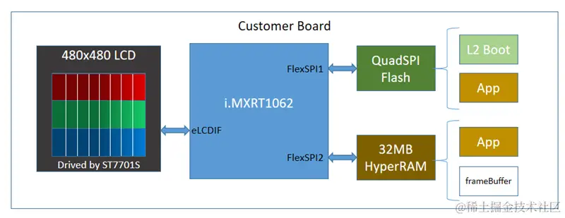 先给大家简单描述一下这个LCD显示异常亮点问题,客户使用的是一块由ST7701S驱动的480x480分辨率的RGB接口LCD屏,主控芯片是i.MXRT1062,客户在FlexSPI1接口上挂了一片QuadSPI Flash存放应用程序,还在FlexSPI2接口上挂了一片HyperRAM做显存。为了验证系统是否正常,客户设计了一个LCD显示测试程序(即下图中的App),这个App连同L2 Boot一起被烧写进QuadSPI Flash,芯片上电启动,BootROM加载L2 Boot运行,L2 Boot完成HyperRAM初始化(为什么设计二级启动后面会解释)后加载App到HyperRAM运行,App里构造uint32_t s_frameBuffer[480][480](像素格式是XRGB8888)内容后借助eLCDIF模块驱动LCD屏显示,s_frameBuffer里的内容就是简单的横向渐变色,但是渐变色显示出了问题,如下图中左边LCD示意图所示,均匀地出现了几根不明白色纵向线条。