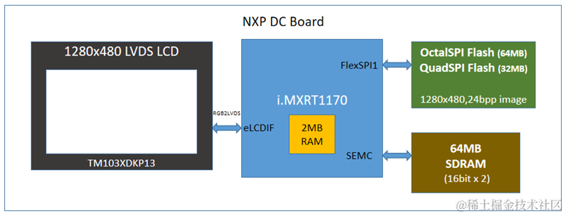 先来看一下这个项目板卡简图,简图里只示意了痞子衡今天要分享的LCD问题相关的器件,显示屏是TM103XDKP13控制器驱动的LVDS接口屏,跟i.MXRT连接的话需要有一个RGB2LVDS转接。Flash都是选的旺宏的,一个是MX25UW51345(200MHz,8bit,DDR),还有一个是MX25U25645(133MHz,4bit,SDR)。此外还有两个16bit的W9825G6KH组成的32bit SDRAM做显存,总容量是64MB。