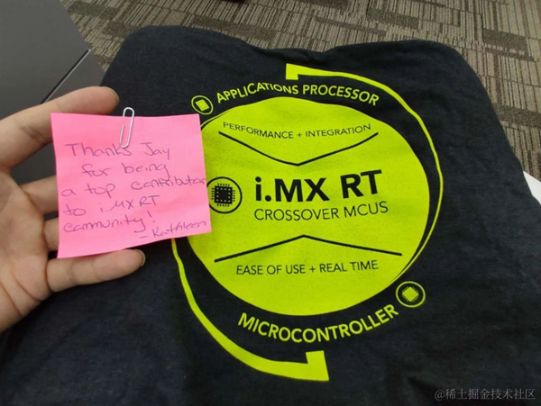 原来快递里面是一件i.MXRT产品纪念T-shirt,还有一个便利贴,看了便利贴上的内容,痞子衡才回想起来是怎么回事。