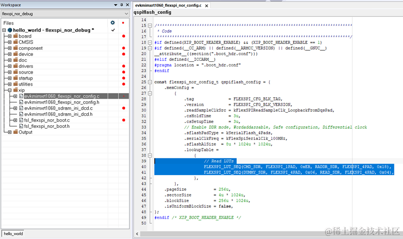 我们知道i.MXRT1060-EVK上默认连的是ISSI的8MB QSPI Flash,SDK XIP工程里默认使用了它的配置,在 \SDK_2.x.x_EVK-MIMXRT1060\boards\evkmimxrt1060\xip\evkmimxrt1060_flexspi_nor_config.c中定义了常量 qspiflash_config,我们可以参考这个常量定义。