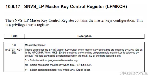 SNVS全称Secure Non-Volatile Storage,它既是DCP的配套模块,也是芯片系统的安全事务监测中心。它能够提供一个独特的Master Key给DCP模块,这个Master Key可有三种产生方式(在SNVS_LPMKCR中设置):