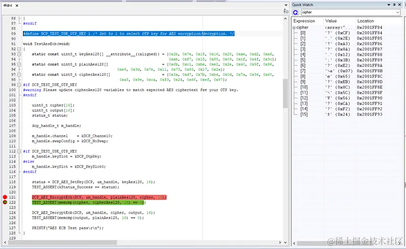 在初始芯片状态(Hab Open)下,使用J-Link下载工程进RAM直接单步调试看一看,在执行完DCP_AES_EncryptEcb()函数后查看cipher[]数组,可以看到其值为0xCF, 0x2E, 0xA3...,好吧我们根本不知道SNVS Master Key到底是多少,所以这个密文是否正确也无从知晓。