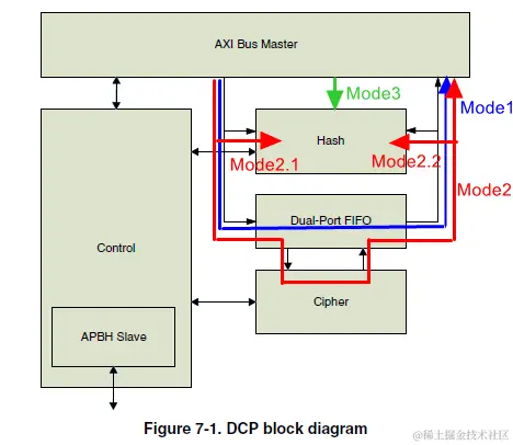 看到DCP支持的功能,你就能明白其模块命名的由来了。本质上它就是一个数据处理加速器,如果说CRC-32/Hash算法只是算出一个结果(下图中Mode3),而AES算法则是明文数据到密文数据的转换(存在数据迁移,下图中Mode2),DMA式数据搬移则更明显了(下图中Mode1),DCP内部集成了memcopy功能,可以实现比普通DMA方式效率更高的内存到内存数据块搬移,memcopy功能还支持blit模式,支持传输矩形数据块到frame buffer用于LCD显示。