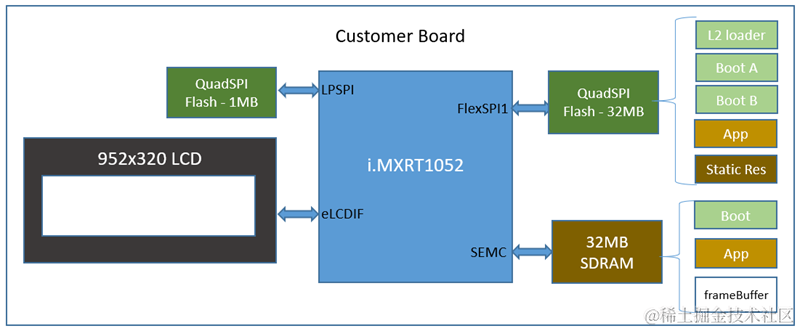 在描述问题前,首先给大家介绍下客户的项目设计,底下是客户硬件简图。客户选用的i.MXRT1052作为主控,挂载了两个QSPI Flash,FlexSPI接口连接的32MB Flash用于启动和存放静态图片资源(只需要读即可),LPSPI接口连接的1MB Flash用于存放运行时状态数据(需要读写),此外板子连接了一个显示屏,所以还挂载一片SDRAM用于显示缓存,其实SDRAM除了显示缓存功能之外,还用于执行App(QSPI Flash里的App会自加载到SDRAM执行)。