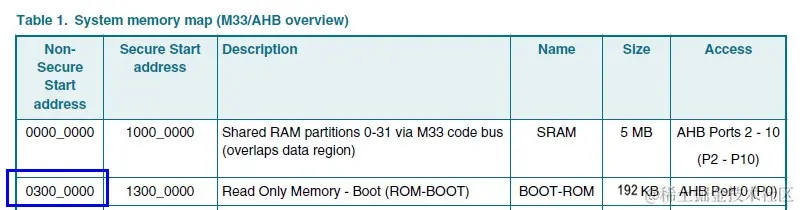下表是i.MXRTxxx系列代表型号i.MXRT500的部分系统内存映射,可以看到ROM区域起始地址是0x03000000(非安全域)。目前i.MXRTxxx都是Cortex-M33内核,支持TrustZone特性,所以0x13000000也是ROM起始地址(安全域),为了通用性,我们认0x03000000就可以了,这个地址在安全状态和非安全状态下都能被访问。