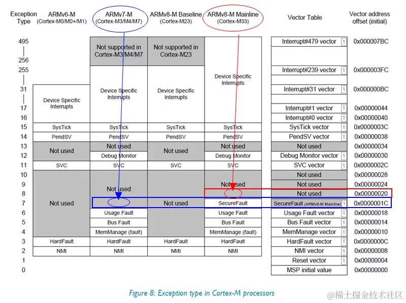 但是由于i.MXRTxxx是Cortex-M33内核,属于ARMv8-M架构,从下图中可以看出ARMv8-M架构下中断向量表第8个向量是SecureFault,已经被定义了,因此BootROM把g_bootloaderTree地址值放到了第9个向量的位置处(该向量为ARMv8-M架构下未定义的系统向量),故读取0x03000020处开始的4bytes才能找到i.MXRTxxx系列的g_bootloaderTree(这种方式在实际API调用中并不可取,至于原因嘛,先卖个关子)。