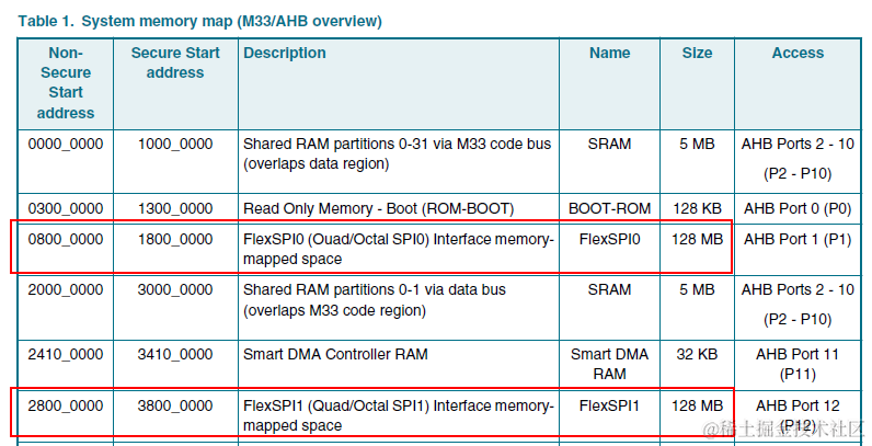 i.MXRT600中分配给FlexSPI的系统映射空间如下,一个FlexSPI分配了128MB。