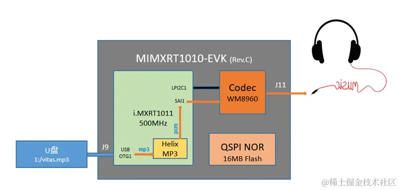 为了让大家见识到i.MXRT1011的能量,特给大家分享一个基于i.MXRT1011-EVK开发板的MP3播放器设计,mp3源文件从U盘获取,使用Helix MP3库进行软解码,最后将解码出的pcm数据通过板载Codec(WM8960)连耳机进行播放。