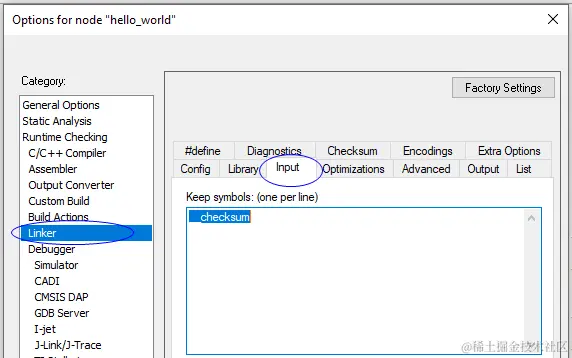 设置好之后重新编译工程,此时会报错“ielftool error: The string '__checksum' was not found in the string table ”,因为在程序代码里,我们完全没有任何CRC相关的引用,IAR会忽略界面里使能的CRC功能,所以我们还需要将__checksum强行加入如下选项里(注意__checksum是IAR里默认定义的CRC检验值符号名)。