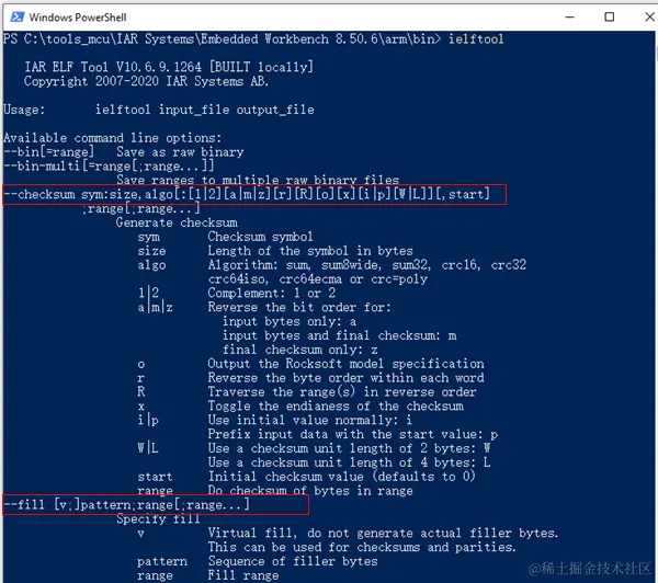 ielftool.exe工具跟CRC相关的一共两个参数选项,一是--fill用于填充,二是--checksum用于设置算法,具体参数使用细节详见 \IAR Systems\Embedded Workbench 8.50.6\arm\doc\EWARM_DevelopmentGuide.ENU手册里的Checksum calculation for verifying image integrity小节。