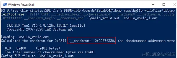 让我们随便找一个嵌入式IAR工程按上面设置生成源hello_world.out文件,并使用ielftool工具执行一次命令看看,可以看到产生了__checksum值,新生成的hello_world_1.out文件里包含了正确的CRC校验结果。