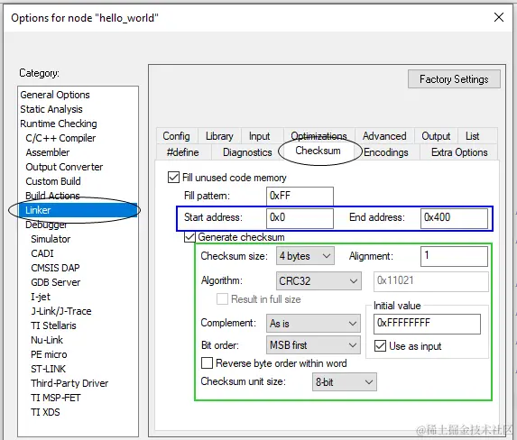 下图示例配置中有两点要说明:一、算法选择了CRC32,其多项式系数其实固定为0x04C11BD7;如果想自定义CRC32多项式系数值,可选CRC polynomial;二、因为地址设置的是 0x0 - 0x400,一共1025个字节(包含0x400),所以checksum unit size此处仅能选8-bit,因为IDE强制要求地址对齐。