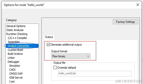抛开CRC完整性校验功能,以一个正常嵌入式工程来说,比如 \SDK_2.8.2_FRDM-K64F\boards\frdmk64f\demo_apps\hello_world\iar\,这个工程正常编译链接后一定会生成.out可执行文件(其实就是标准.elf文件)。如果我们希望同时能生成一个.bin镜像文件,需要借助工程选项Output Converter: