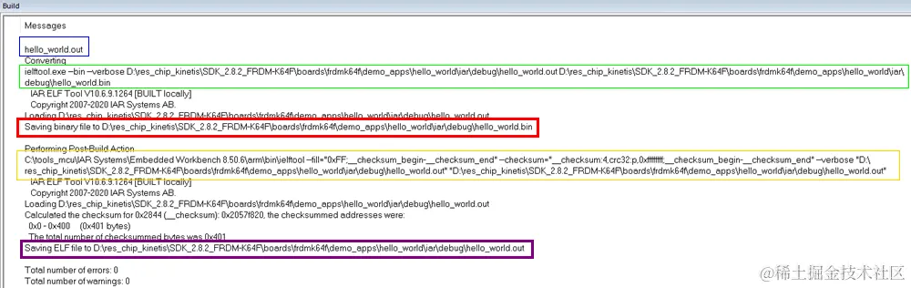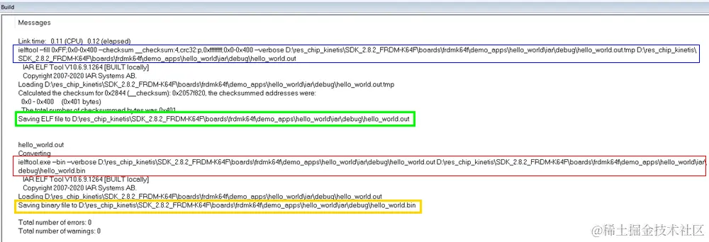 我们编译工程看一下编译信息,从日志输出顺序来看,首先生成了hello_world.out(蓝色框标出),然后调用了ielftool工具执行转换命令(绿色框标出),最后生成了hello_world.bin(红色框标出):