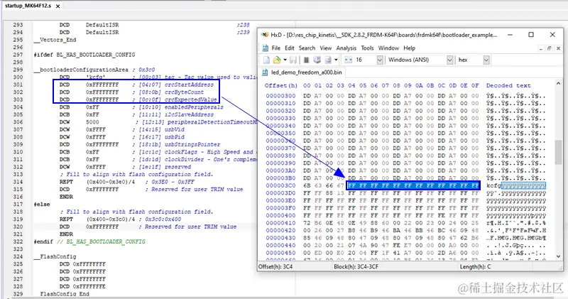 我们以MK64FN1M这颗芯片为例,下载它的软件包,软件包里有KBOOT及其示例Application,找到 \SDK_2.8.2_FRDM-K64F\boards\frdmk64f\bootloader_examples\demo_apps\led_demo_freedom_a000\iar 下的Application工程,工程源文件 startup_MK64F12.s 里定义了__bootloaderConfigurationArea,但是CRC区域是全0xFF(即没有使能),编译生成的bin文件里CRC区域也是全0xFF,我们要做的就是填入正确的CRC。