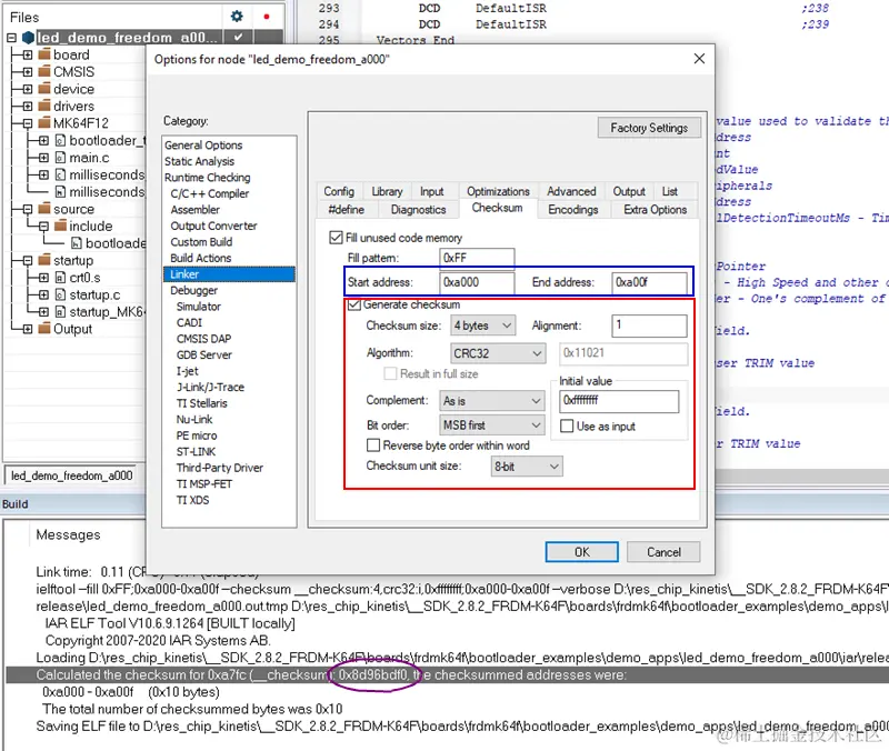 我们现在回到led_demo_freedom_a000工程,在Linker/Checksum下,使能CRC功能,为了与上述测试一致,CRC计算范围设为 0xa000 - 0xa00f(因为程序起始链接地址是0xa000,所以也就是最终.bin里的前16个字节)。查阅IAR development手册,做了如下CRC算法参数设置,编译工程得到结果也是0x8D96BDF0,因此CRC设置是匹配的。