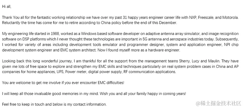这周五,痞子衡收到了一位来自恩智浦深圳分公司同事的离职信,这位同事在摩托罗拉、飞思卡尔、恩智浦(其实算是在一家公司,没有跳槽)工作了31年,因为到了法定退休年龄而从公司离职。