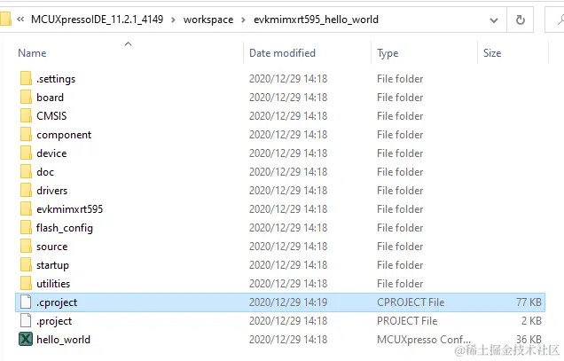 导入完成后,在workspace路径下,你可以看到多了一个名为evkmimxrt595_hello_world文件夹,这个文件夹下既有MCUXpresso IDE的工程文件(.project/.cproject),也有SDK包里hello world例程所需的全部源文件。是的,Import SDK example 操作会从SDK包里拷贝出全部必要的文件组成一个独立的项目文件夹,从此这个项目文件夹将不再依赖原始的SDK包。
