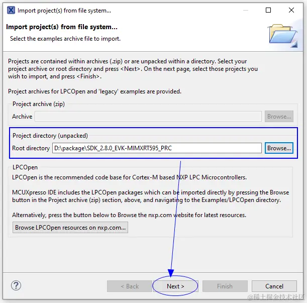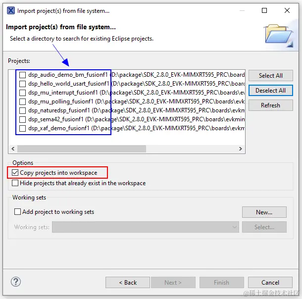再来看第二种 Import project(s) from file system,这是从本地直接导入现有工程,那么解压后的SDK_2.8.0_EVK-MIMXRT595_PRC包里有没有工程呢?我们试着导入看看瞧: