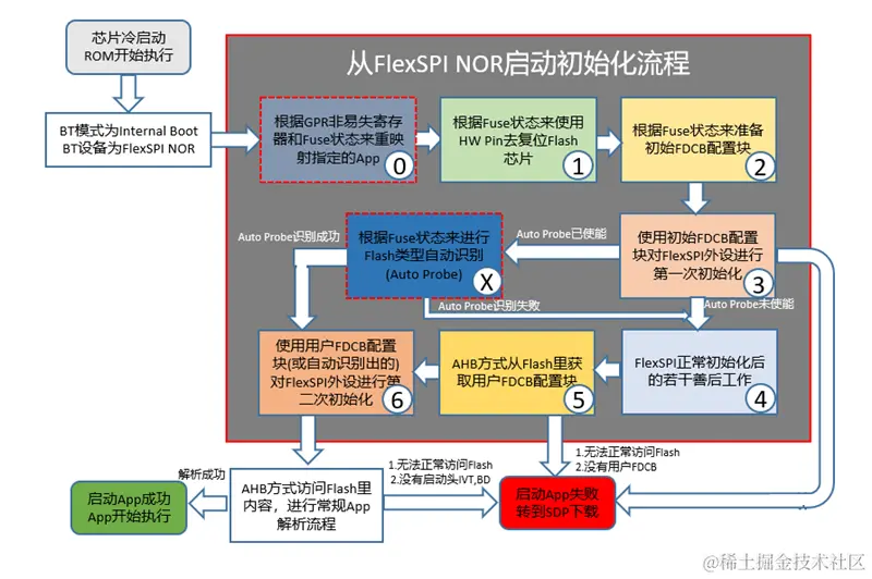 先从整体FlexSPI NOR启动初始化流程图上来看,自动识别(步骤X)被插入了初始化流程中,安排在FlexSPI外设第一次初始化之后,BootROM此时会尽力尝试去识别外接的Flash信息,如果识别成功则会得到一个自识别FDCB配置块,然后直接跳到FlexSPI NOR第二次初始化流程。如果识别失败,则继续按原来方式尝试读取用户FDCB配置块来获取外接Flash信息。