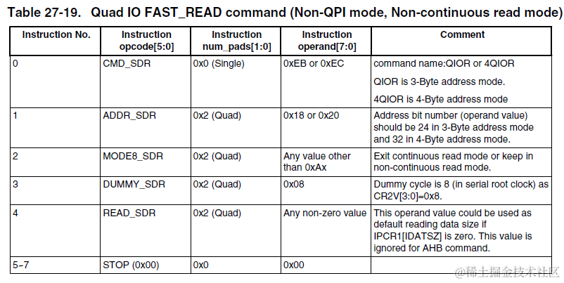 有了这些基础instruction,我们便可以自由组合它们(最多8个),得到我们想要的完整传输Sequence。比如最常见的Quad I/O Read SDR传输时序便由CMD_SDR + RADDR_SDR + MODE8_SDR + DUMMY_SDR + READ_SDR + STOP六个子序列组成,如下表所示: