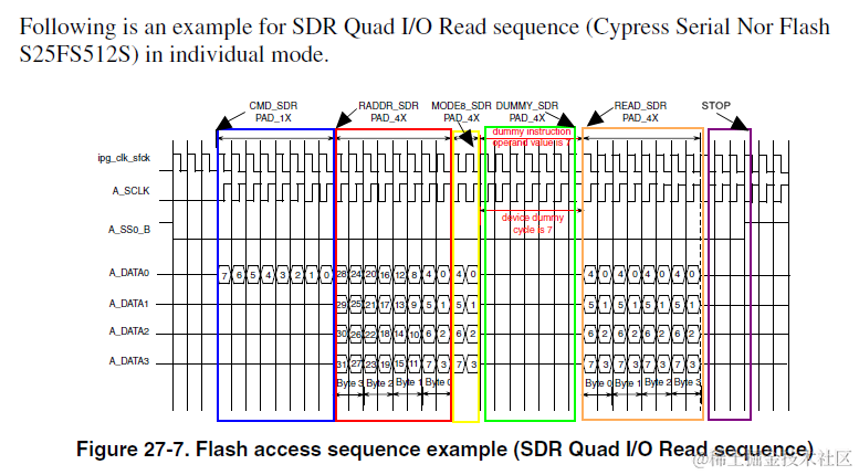 从引脚信号上来看,完整Quad I/O Read SDR传输时序如下图所示。注意有一处要特别说明,从FlexSPI外设本身而言,MODE8_SDR序列和DUMMY_SDR序列是互相独立的,但在不少Flash芯片上,MODE8_SDR所占的2个时钟周期也被算在了总Dummy时钟周期数里。