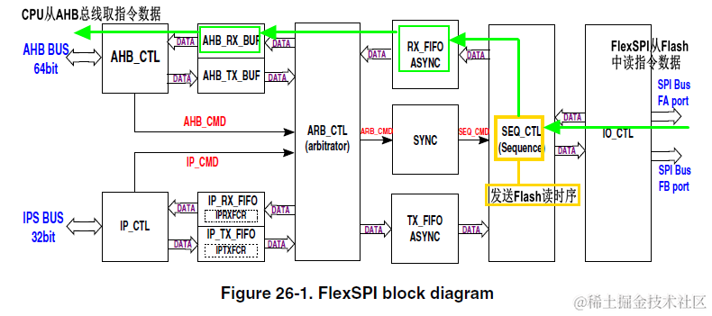 当PC开始指向FlexSPI映射空间(0x60000000 - 0x607FFFFF)去执行用户程序时,FlexSPI便在背后一直默默为CPU送上指定的指令数据,如下图绿色箭头流向所示。指令数据从外部Flash中通过IO_CTL且按照SEQ_CTL指定的时序送入RX_FIFO,再到AHB_RX_BUF,最后经过AHB_CTL送到系统AHB总线上,以被CPU无障碍获取。整个过程中最重要的自动化环节其实是黄色框内的SEQ_CTL,是这个SEQ_CTL在时刻驱动着FlexSPI发送符合Flash要求的读访问时序。