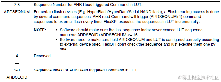 但是毕竟应用程序是由BootROM引导的,BootROM有自己的一套配置FlexSPI规则,它定死了CMD_LUT_SEQ_IDX_READ位置,即读访问时序必须是FlexSPI->LUT[]中第一个Sequence,因为FlexSPI->FLSHxCR2[ARDSEQID]被BootROM配置成了0。所以我们在准备FDCB时,lookupTable中第一个Sequence必须放置读访问时序。