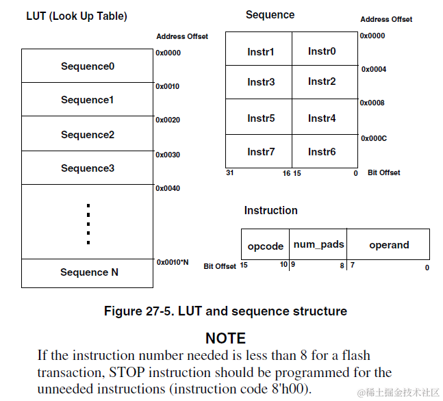 LUT中最多可以存储16个Sequence,对于XIP执行而言,只需要一个读访问时序(比如最常用的Quad I/O Read SDR传输时序)即可。如果是IAP,那么还需要添加擦除时序,写访问时序,写使能时序,读状态寄存器时序等。这些预先存放在LUT中的Sequence被用户按需触发以实现各种不同类型的Flash访问,这就是SEQ_CTL工作机制。