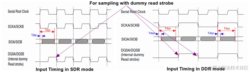 下图是FlexSPI的输入时序图(FlexSPI从Flash读取存储数据)。左边是SDR模式,可以看到FlexSPI是在DQS的下沿才会去锁存一次SIO上的数据。右边是DDR模式,FlexSPI外设在DQS的上沿和下沿都会去锁存一次SIO上的数据。注意不管是SDR模块还是DDR模式,DQS信号都是与SCK同频的。