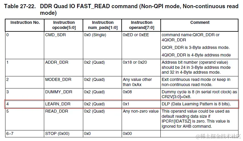了解了SDR与DDR模式区别,我们再来看LUT里Quad I/O Read DDR传输序列,它由CMD_SDR + RADDR_DDR + MODE8_DDR + DUMMY_DDR + LEARN_DDR(可选) + READ_DDR + STOP七个子序列组成,如下表所示。