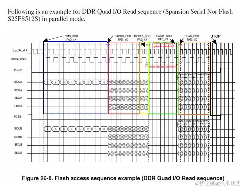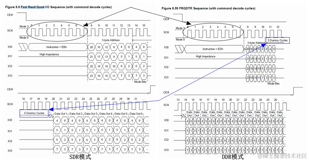 Note: 特别注意,虽然存在CMD_DDR子序列,但Quad I/O Read DDR传输下发送命令规定使用CMD_SDR子序列。