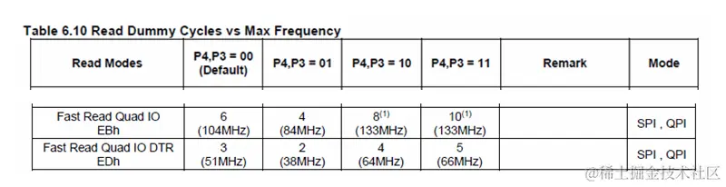 此外,该款Flash在DTR模式下最高能支持到66MHz,客户在FDCB里配置SCK频率为 kFlexSpiSerialClk_60MHz 是没问题的,这个速度下DTR模式需要4个SCK周期做Dummy Cycle,Flash器件里的默认值3按说不符合要求,但实测启动也没问题。