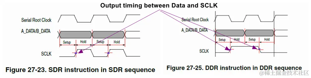 再来看FlexSPI的输出时序图(FlexSPI给Flash发送地址,模式等)。左边是SDR模式,Flash器件应在SCK的上沿去锁存DATA (SIO)上的数据。右边是DDR模式,Flash器件需要在SCK的上沿和下沿都去锁存DATA (SIO)上的数据。